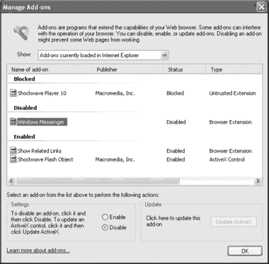Модули расширения браузера представляют собой элементы управления ActiveX, вспомогательные объекты и расширения инструментальной панели, которые намеренно или неосознанно устанавливаются пользователями. Модули расширения могут быть установлены самими пользователями при запуске выполняемого файла либо без их ведома при просмотре Web-страниц. Применение модулей расширения обоих типов связано с риском, но самоустанавливающиеся модули особенно опасны, — например, сотрудники предприятия могут случайно установить модуль расширения, который записывает пароль и имя пользователя и пересылает его на сервер в Internet. С помощью диспетчера модулей расширения XP SP2 IE пользователи могут просматривать, активизировать, блокировать и обновлять все модули расширения IE. Благодаря функции обновления, пользователь может связаться с Web-узлом издателя модуля и загрузить последнюю его версию. Кроме того, в диспетчере предусмотрена функция обнаружения аварийных ситуаций, вызванных модулями расширения. Если сбой IE происходит из-за модуля расширения, браузер предлагает пользователю отключить такой модуль.