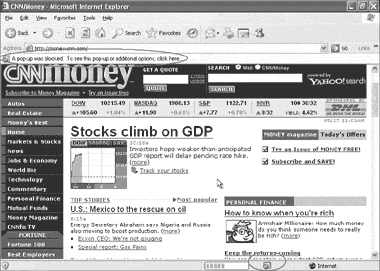 Всплывающие окна автоматически появляются в браузере при просмотре Web и обычно содержат рекламу. Естественно, они доставляют массу хлопот пользователям Internet. До появления XP SP2 пользователям IE приходилось устанавливать дополнительные программы для блокировки всплывающих окон (например, инструментальные панели Google Toolbar и MSN Toolbar, которые предоставляют эту услугу, можно бесплатно загрузить из http://toolbar.google.com и http://toolbar.msn.com, соответственно). Но в версии IE из пакета XP SP2 предусмотрена встроенная функция блокировки, которая активна по умолчанию.