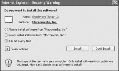 В SP2 были усовершенствованы диалоговые окна загрузки и установки модулей расширения IE. Теперь в них содержатся предупреждения об опасности, связанной с установкой модулей расширения IE. На экране 2 показано предупреждение, выдаваемое при попытке пользователя загрузить файл из Web; на экране 3 показано предупреждение, адресованное посетителю Web-узла, который пытается установить модули расширения (например, элементы управления ActiveX) от непроверенного издателя. Непроверенные издатели — это провайдеры Web-контента, который не заверен действительной цифровой сигнатурой. По умолчанию браузер IE из пакета SP2 с неизвестным контентом не работает. Параметр реестра RunInvalidSignatures в разделе HKEY_LOCAL_MACHINESOFTWAREMicrosoftInternet ExplorerDownload или в разделе HKEY_CURRENT_USERSoftwareMicrosoftInternet ExplorerDownload управляет режимом приема контента и имеет стандартное значение 0.
