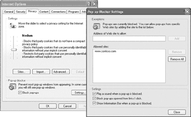 Другой способ — открыть диалоговое окно Pop-up Blocker Settings с помощью функции Pop-up Blocker из меню Tools. Можно также перейти в меню Tools и выбрать пункт Internet Options или открыть утилиту Internet Options панели управления, а затем перейти на вкладку Privacy, выбрать пункт Block pop-ups и щелкнуть на Settings в разделе Pop-up blocker (экран 5), чтобы открыть диалоговое окно.