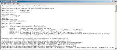 Текущее определение параметров, отображаемых в редакторе шаблонов безопасности в разделе Local PoliciesSecurity Options, хранится в файле %Windir%infSecregvl.inf. Туда следует добавить строку определенного синтаксиса (который описан в комментариях внутри самого файла) по каждому параметру реестра, который требуется править (см. экран 4).