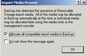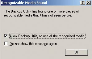 При запуске NTBackup выполняется проверка назначения текущей ленты. Если NTBackup определяет, что лента приложению назначена, но назначение не зафиксировано в базе данных Removable Storage (например, если лента использовалась на другом компьютере), то утилита выясняет, следует ли переместить ленту в пул носителей NTBackup на этом компьютере. На экране 3 показано диалоговое окно, выводимое в Windows 2003 и Windows XP. На экране 4 представлено диалоговое окно Windows 2000. Как видно, текст в двух диалоговых окнах существенно различается и может вызвать затруднения у пользователей, только что перешедших с Windows 2000 на Windows 2003. Чтобы ввести ленту в пул NTBackup, следует установить флажок Allow Backup Utility to use all the recognized media (Windows 2003 и XP) или флажок Allocate all compatible import media to Backup (Windows 2000) и щелкнуть на кнопке OK. Альтернативный способ — управлять работой NTBackup, настраивая стандартные параметры утилиты. Нужно открыть NTBackup, выбрать пункт Options из меню Tools и щелкнуть на вкладке General. В Windows 2003 и XP следует установить флажок Always allow use of recognizable media without prompting. В Windows 2000 нужно установить флажок Always move new import media to the Backup media pool. Вопреки формулировке этого сообщения, данная операция не назначает ленту для NTBackup; просто запись о ленте перемещается в пул носителей NTBackup.