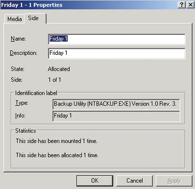 В столбце Name консоли Removable Storage (экран 1) имя ленты указано как Friday 1 — 1, а в поле Info на вкладке Side (экран 2) имя ленты — Friday 1. Служба Removable Storage поддерживает носители с числом сторон более одной; символы «- 1» после имени ленты относятся к первой назначенной стороне. Второй стороне двустороннего носителя с возможностью перезаписи присваивается обозначение «- 2». Служба Removable Storage автоматически добавляет номер стороны, который используется только при отображении ленты в консоли Removable Storage.