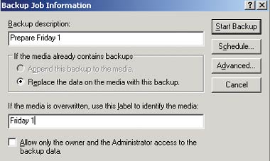 Интерфейс Advanced Mode систем Windows 2003 и XP почти идентичен интерфейсу NTBackup в Windows 2000, поэтому следующий шаг во всех трех операционных системах — перейти к вкладке Backup. В левой панели необходимо выделить (только выделить) системный диск. Не стоит выбирать его для резервного копирования. В правой панели нужно выбрать малый файл, например boot.ini (экран 5). Из меню Job необходимо выбрать пункт Save Selections. Появится диалоговое окно, в которое следует ввести отражающее смысл имя (например, Prepare.bks) и щелкнуть на кнопке Save. После возвращения к вкладке Backup следует убедиться, что в раскрывающемся списке Backup media or file name выделен пункт New (Windows 2003 и XP) или New Media (Windows 2000). Для вывода на дисплей диалогового окна Backup Job Information нужно щелкнуть на кнопке Start Backup (экран 6). Стандартные элементы диалогового окна Backup Job Information носят общий характер, поэтому их необходимо отредактировать в соответствии с конкретным заданием. Описание, введенное в текстовом поле Backup description, заносится в файл журнала резервного копирования и отображается в столбце Description вкладки Restore and Manage Media (Windows 2003 и XP) или вкладки Restore (Windows 2000) в пользовательском интерфейсе NTBackup. Метка, введенная пользователем во втором текстовом поле, определяет имя ленты, которое будет отображаться в интерфейсах NTBackup и Removable Storage. Можно назначить метку в соответствии с ролью ленты в схеме ротации резервных носителей (например, Monday 1, Friday 2). В данном примере мы используем ленту с именем Friday 1, так как резервное копирование будет выполняться в первую пятницу каждого месяца. Когда все будет готово для резервного копирования, следует щелкнуть на кнопке Start Backup.