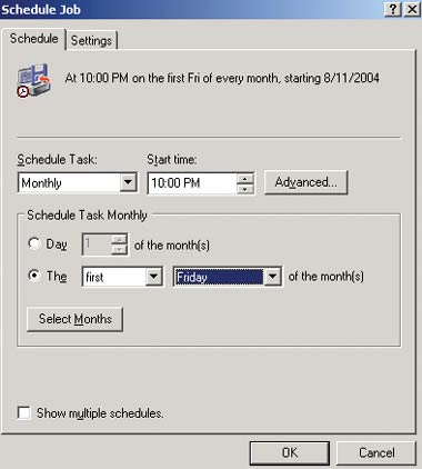 На странице When to Back Up назначается имя и расписание задания. Имя, назначенное заданию, будет именем плановой задачи. В данном примере следует ввести имя задачи Friday 1 Full Server Backup. Чтобы составить расписание, нужно щелкнуть на кнопке Set Schedule. В диалоговом окне Schedule Job необходимо указать время выполнения задания. В данном примере выполнение задания запланировано на 10 часов вечера в первую пятницу каждого месяца (экран 9). После того как пользователь щелкнет на кнопке OK, чтобы выйти из диалогового окна, NTBackup попросит ввести пароль текущей учетной записи. Или же можно указать данные другой учетной записи. Если указаны данные другой учетной записи, Windows 2003 и XP выводят на экран предупреждение. В Windows 2000 предупреждение отсутствует. Это сообщение появляется, так как список выбранных файлов резервной копии, используемый для текущего задания, хранится в профиле текущего пользователя, а не в профиле другой учетной записи.