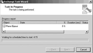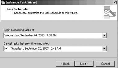 Очевидно, не стоит переносить часть почтовых ящиков пользователей в рабочее время. Перенос почтовых ящиков значительно загружает систему и ухудшает производительность. В версии Exchange 2000 Move Mailbox Wizard можно было осуществлять операцию переноса в нерабочее время, но только вручную — требовалось выполнять соответствующие операции и нажимать на кнопки. Если пользователь хотел это делать без получения запросов, он должен был задействовать сценарии и командные файлы, запуская их по расписанию (например, с помощью winat.exe).