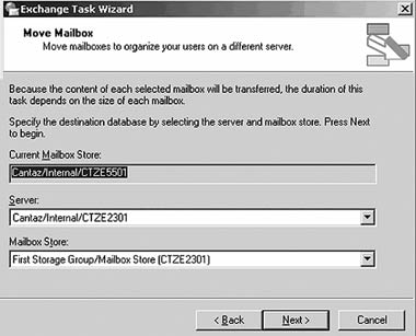 В предыдущей версии утилита Move Mailbox Wizard была доступна только из оснастки Active Directory Users and Computers, поскольку перенос почтовых ящиков относился к функциям управления учетными записями пользователей. Утилита Exchange 2003 Move Mailbox Wizard сохранилась доступной в оснастке Active Directory Users and Computers, но теперь перенос почтовых ящиков является типичной задачей управления Exchange, и поэтому утилита доступна и в оснастке ESM. Такое двойственное расположение утилиты Move Mailbox Wizard объясняется тем, что System Manager позволяет увидеть фактическое состояние базы данных Exchange перед переносом учетных записей. Делая Move Mailbox Wizard доступным в оснастке ESM, Microsoft собирает всю информацию в одной точке.