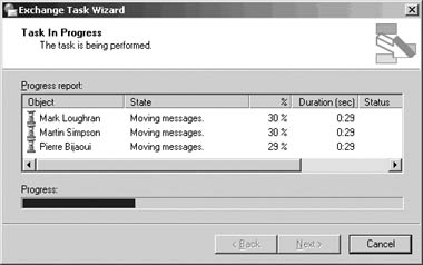 Версия Exchange 2000 Move Mailbox Wizard менее производительна и масштабируема. Хотя можно, используя в Microsoft Management Console (MMC) оснастку Active Directory Users and Computers, выбирать множество пользовательских объектов, утилита будет обрабатывать объекты строго последовательно. Например, если выбрать пять учетных записей пользователей, то операция переноса почтового ящика для User2 начнется после завершения операции переноса для User1 и т. д.