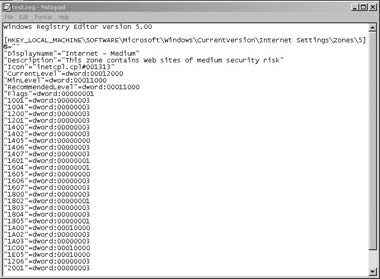 Простой способ добавить новую зону в IE — скопировать существующую зону и изменить ее режим безопасности. Чтобы скопировать зону, следует запустить regedit и воспользоваться функцией Export для экспорта раздела зоны в файл .reg. В этом случае экспортируется раздел Zone 4, так как это последняя зона при стандартной установке IE.