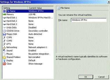 Установка Virtual PC занимает всего несколько минут. В программе имеется небольшое число настроек, поэтому основное время будет потрачено на установку и настройку виртуальных сессий. Несложный мастер позволяет настроить память до трех жестких дисков, до четырех сетевых карт, обеспечить поддержку COM-портов, параллельных портов и звуковой карты. На экране показана панель настройки виртуальной сессии.