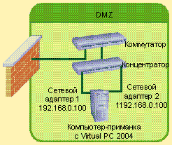 Вероятно, потребуется две сетевые карты. Поскольку виртуальные сессии не имеют собственных физических сетевых карт, виртуальная сессия и хост будут использовать основную сетевую карту. Для обеспечения такой возможности Virtual PC поддерживает драйвер устройства для виртуального сетевого адаптера. В процессе создания приманки также требуется, чтобы на хост было установлено дополнительное программное обеспечение (например, брандмауэр и сетевой монитор), которое реализует поддержку драйверов устройств на сетевом уровне. Эти драйверы, подобно драйверу Virtual PC, смогут отклонить или изменить входящий или исходящий трафик. Иными словами, чтобы получить истинную трассу пакета из входящего или исходящего трафика на системе-приманке, лучше всего перехватывать трафик со второй сетевой карты. Две сетевые карты системы могут быть включены в концентратор (см. рис. 2), после чего основной интерфейс будет настроен на публичный адрес в демилитаризованной зоне (DMZ), а второй интерфейс — на приватный адрес в зоне, отличной от DMZ (в идеале этот адрес маршрутизироваться не должен). Затем второй сетевой адаптер нужно перевести в режим прослушивания (promiscuous mode: состояние, в котором сетевой адаптер обнаруживает в сети все фреймы вне зависимости от их конечного адреса), для перехвата трафика от первого адаптера.