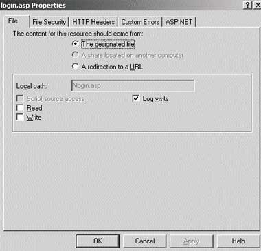 Обратите внимание на разрешения для индивидуальных файлов. Например, лишь немногим администраторам известно, что не нужно разрешать доступ по чтению к файлам .asp и что следует сбросить флажок Read для всех .asp-файлов из консоли IIS Manager (см. экран 1).