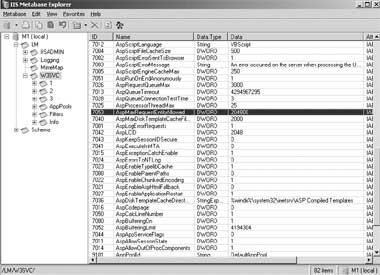Многие параметры IIS недоступны непосредственно из IIS Manager, но с их помощью можно остановить атаку или сузить ее область. Например, в ходе атаки с переполнением буфера на Web-узел обрушивается огромное количество данных. Администраторы IIS 6.0 могут использовать параметры метабазы MaxRequestEntityAllowed и AspMaxRequestEntityAllowed, чтобы ограничить размер тела запроса или запроса Active Server Pages (ASP) соответственно. Эти параметры позволяют установить максимальный размер в байтах тела запроса, указанный в заголовке величины контента HTTP. Редактировать базу данных можно с помощью инструмента IIS Metabase Explorer (см. экран 2). Metabase Explorer входит в пакет Microsoft IIS 6.0 Resource Kit Tools, который можно загрузить с сайта http://www.microsoft.com. В табл. 1 показаны некоторые параметры метабазы, которые иногда полезно менять. В табл. 2 приведено несколько параметров реестра, изменение которых также желательно.