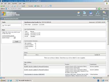 Полную статистику работы можно просмотреть, нажав кнопку Reports. Здесь можно получить отчет о результатах развертывания исправлений и синхронизации с сервером Windows Update (см. экран 6).