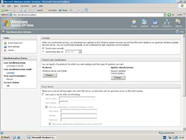 После установки первым делом нужно задать параметры сервера WUS. Для этого в окне администрирования необходимо нажать кнопку Options и выбрать пункт Synchronization Options (см. экран 1). На этом экране требуется выбрать время для синхронизации, параметры proxy-сервера, источник синхронизации и язык загружаемых обновлений. В отличие от SUS, здесь можно выбрать классы обновлений (см. экран 2): обновления для системы безопасности, критические обновления, кумулятивные обновления, пакеты обновлений, драйверы и многое другое. Выбор необходимой комбинации классов исправлений позволит значительно сократить Internet-трафик и проверять загружаемые обновления.
