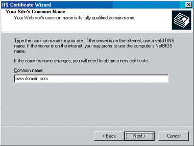 Эта страница — ключевая в мастере. Введенные в ней данные определяют стандартное имя (common name — CN) сертификата Web-узла. CN должно соответствовать как имени, используемому удаленными пользователями для доступа к Web-узлу OWA, так и имени, которое применяется при перенаправлении, когда создается правило Web-публикации в брандмауэре ISA. В данном примере используется имя owa.domain.com. В производственной среде применяется имя, с помощью которого удаленные пользователи обращаются к Web-узлу OWA.