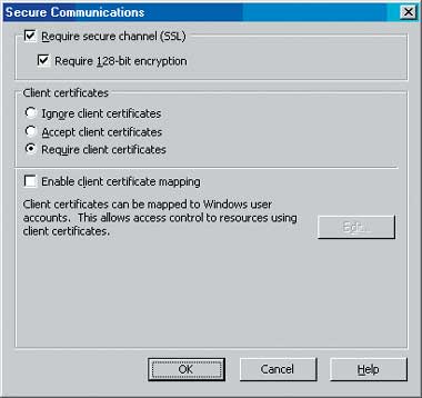 В левой панели оснастки Internet Information Services (IIS) Manager нужно щелкнуть правой кнопкой мыши на каталоге Exchange и выбрать пункт Properties, а затем перейти прямо на вкладку Directory Security, открыть диалоговое окно Secure Communications, как объяснялось выше, и установить те же флажки и режимы, которые были выбраны для каталога ExchWeb. Нажмите OK.