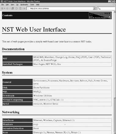Пользовательский Web-интерфейс NST (экран 1) — самый простой способ получить доступ к большинству инструментов через сеть с другой машины. В Web-интерфейсе приведены ссылки для Snort, Analysis Console for Intrusion Databases (ACID), Nessus, Nmap, Kismet, BandwidthD, Ettercap, Firestarter и других инструментов; некоторые из них показаны на экране 1. Есть в Web-интерфейсе и полезная возможность доступа ко многим из этих инструментов. Например, анализатор безопасности Nessus и утилита BandwidthD выдают результаты в Web. В Web-интерфейсе имеются функции мониторинга и управления сервером. Например, через Web-интерфейс можно знакомиться с журналами Web, запускать команды, просматривать процессы и устройства, перезагрузить или выключить сервер.