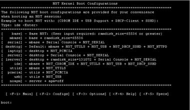 Существует несколько вариантов начальной загрузки NST. Процедура загрузки на несколько секунд приостанавливается, и пользователь может выбрать режим из списка конфигураций ядра и загрузочных параметров (экран 2). Если не нажать клавиши в течение 5 секунд, то NST загружается со стандартными параметрами. Если NST не загружается, необходимо начать процедуру заново и внимательно изучить меню параметров загрузки, так как одна из альтернативных конфигураций может оказаться удачной.