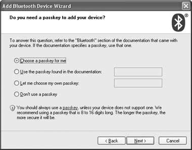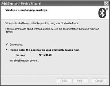 При создании соединения двух устройств необходимо при всякой возможности защищать канал связи между ними с помощью средств аутентификации и шифрования. На экране 3 показано диалоговое окно, которое отображается на экране в тех случаях, когда я пытаюсь соединить свою настольную систему Windows XP SP2 и смартфон. Если общий ключ не применяется, пользователь может активизировать средства аутентификации и шифрования. В рассматриваемом примере я решил, что общий ключ мне предоставит Windows, и система, как показано на экране 4, предложила мне ввести этот общий ключ в смартфон.