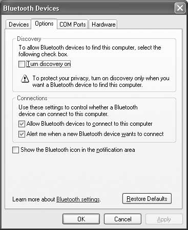 Если требуется соединить два устройства Bluetooth, я рекомендую воздерживаться от выполнения этой операции в людных местах, таких как станции пересадок или кафе. Лучше выбрать какой-нибудь уединенный уголок, где шансы наткнуться на охотника за сигналами Bluetooth минимальны. Чтобы начать процедуру соединения, потребуется перевести одно из устройств в режим discoverable. Никогда не следует выставлять «напоказ» оба устройства, и всегда нужно переводить подчиненное устройство в невидимый режим по завершении операции. При работе на настольной системе с подключенными по каналам Bluetooth клавиатурой и мышью средства связи Bluetooth должны быть включены, но это не значит, что они должны функционировать в режиме discoverable.