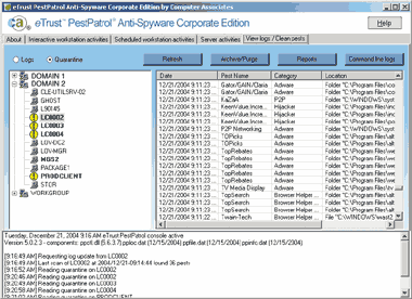 Менее чем за одну минуту я установил на сервере управления консоль и поставляемое вместе с продуктом руководство Network Administrator?s Guide в формате PDF, а затем запустил программу из меню Start. После запуска программы я получил сообщение о свежих обновлениях и возможность немедленно загрузить их. После модернизации открылся экран консоли (экран 1). Я выполнил быструю проверку тестовых клиентов в режиме Log only, и PestPatrol вывел на экран информацию обо всех обнаруженных вредителях. Затем я выбрал режим Quarantine для поиска вредителей и повторил сканирование. Для удаления отправленных в карантин объектов я перешел на вкладку View logs/Clean. При просмотре журналов или отправленных в карантин объектов можно дважды щелкнуть на элементе, чтобы получить более подробную информацию из оперативной энциклопедии Pest Encyclopedia.