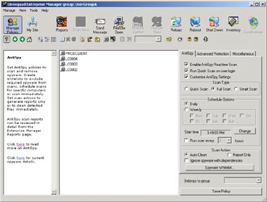 Я выполнил быстрое сканирование тестового клиента вручную в режиме Report Only, и Omniquad AntiSpy Enterprise Edition обнаружил большинство вредных программ. Вредителей, найденных в каждой системе, можно увидеть с помощью функции Reports. Отчеты составляются только в формате HTML, но доступны другим сотрудникам предприятия без дополнительного программного обеспечения. Чтобы применить нужный набор правил для борьбы со шпионским ПО, в Omniquad AntiSpy Enterprise Edition используются политики, связанные с именами пользователей и компьютеров. К сожалению, из-за некоторой путаницы с группами пользователей и компьютеров и неверной пиктограммы в Administrator?s Guide, на освоение этой процедуры приходится тратить много времени. Выяснилось, что в продукте формируется только одна группа (специально для данного инструмента), в которую можно вносить пользователей или компьютеры для последующего применения указанных параметров.