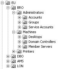 На экране 1 показана структура OU, охватывающая несколько географических районов. Организационные единицы верхнего уровня отражают континенты и города инфраструктуры: Европа — OU верхнего уровня, под ней находятся организационные единицы для Брюсселя (BRO), Дублина (DBO), Амстердама (AMS) и Лондона (LON). OU каждого города разделена на дочерние по типам администрируемых объектов: администраторам, пользователям, машинам и принтерам. Отличительное имя (distinguished name — DN) отражает уровень вложения OU. Например, объект fileserver в структуре OU (экран 1) может иметь следующее DN: CN=FileServer1, OU=Member Servers, OU=Machines, OU=BRO, OU=EU, DC=hp, DC=com.
