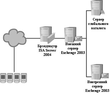 На рисунке показано, каким образом мобильное устройство использует EAS для обмена сообщениями с Exchange 2003. В этом примере я решил отдельно показать внешний сервер, внутренний сервер и брандмауэр Microsoft Internet Security and Acceleration (ISA) Server 2004, хотя для работы EAS ни один из этих компонентов не является обязательным.
