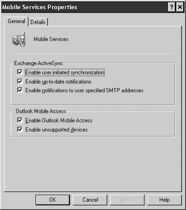 Как показано на экране 1, активизация EAS (а также OMA и AUTD) осуществляется в диалоговом окне Mobile Services Properties. Чтобы открыть это окно, в диспетчере Exchange System Manager (ESM) нужно раскрыть узел Global Settings объекта существующей организации Exchange, щелкнуть правой клавишей мыши на узле Mobile Services и выбрать элемент Properties. Активизировать средства EAS можно, выставив флажок Enable user initiated synchronization. А флажки Enable up-to-date notifications и Enable notifications to user specified SMTP addresses определяют, соответственно, включена ли функция AUTD и может ли EAS направлять сообщения AUTD непосредственно на устройство пользователя.