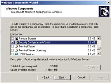 Принимая во внимание значение мастера SCW, удивительно, что он не устанавливается по умолчанию. Вместо этого, не нарушая принцип минимального вмешательства, процесс установки пакета SP1 размещает ярлык SCW на рабочем столе. Однако щелчок на этом значке лишь выведет на экран файлы помощи SCW, а не запустит установку мастера. Чтобы установить его, потребуется использовать приложение Add/Remove Windows Components папки Control Panel, после чего поставить флажок в поле SCW, как показано на экране 1. В процессе установки в меню Administrative Tools будет добавлен пункт Security Configuration Wizard.