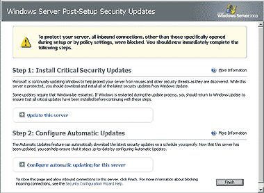 Диалоговое окно PSSU автоматически запускается при первой регистрации в системе, если не использовалось окно Group Policy для детальной активации службы Windows Firewall. Разработанное для защиты сервера от внешних атак после первоначальной загрузки, окно PSSU предлагает установить последние системные обновления и блокировать все входящие соединения. Чтобы завершить работу с PSSU, следует нажать кнопку Finish в диалоговом окне, изображенном на экране 3.