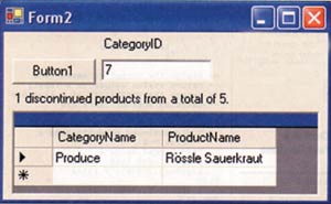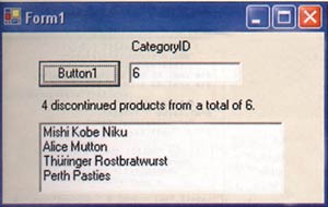 Форма Form1 состоит из кнопки Button 1, текстового поля, описания и списка для отображения значений, возвращаемых хранимой процедурой upDiscontinuedProducts. На экране 1 показаны значения, возвращаемые хранимой процедурой для параметра @CategoryID, значение которого равно 6. Пользователь вводит значение @CategoryID в текстовое поле и щелкает на Button1. Процедура Button1_ Click заполняет описание вверху списка и добавляет в список название каждого переставшего выпускаться продукта заданной категории.