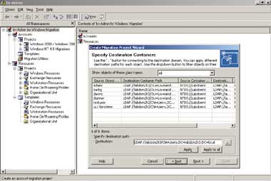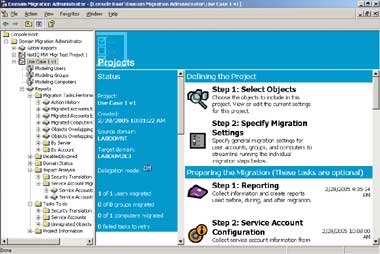 Как показано на экране 1, ADMT состоит из набора мастеров, с помощью которых можно протестировать или выполнить любую задачу миграции. Однако инструмент не позволяет сохранить тестовые параметры, поэтому приходится заново запускать мастеров и восстанавливать параметры, выбранные в ходе тестирования. Из-за отсутствия функций управления проектом на тестах с малыми группами пользователей трудно выбрать из каждой группы пользователей, чьи системы подлежат миграции.