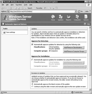 Обновления, полученные из Windows Update или вышестоящего сервера WSUS, не пересылаются в клиенты автоматически. Прежде чем передать обновление, администратор WSUS должен утвердить его для обнаружения и дистрибуции. По умолчанию только критические исправления и исправления для системы безопасности утверждаются для обнаружения на клиентах во встроенной группе All Computers, а обновления автоматически утверждаются для дистрибуции. Администратор может изменить способ автоматического обнаружения и утверждения обновлений и указать соответствующие группы клиентов. Для этого следует щелкнуть на пиктограмме Options, а затем на Automatic Approval Options; в результате на дисплее будет отображена страница, подобная показанной на экране 4.