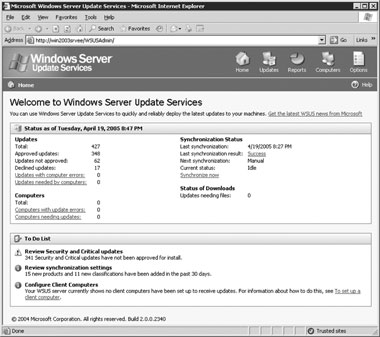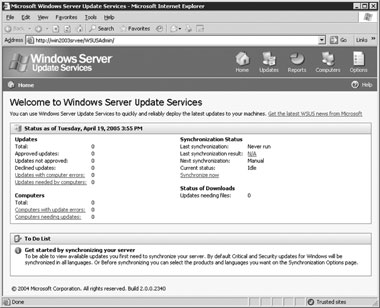 После выбора параметров развертывания и прежде чем приступить к процессу установки и настройки, WSUS выводит итоговый экран. После завершения установки можно запустить административную Web-страницу (экран 1), выбрав пункты All Programs, Administrative Programs, Microsoft Windows Server Update Services из меню Start.