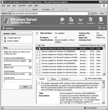 С помощью WSUS можно генерировать отчеты трех типов, щелкая на пиктограмме Reports в административной странице WSUS. Первый отчет — Status of Updates, в котором перечислены исправления, загруженные в сервер WSUS, независимо от того, обозначены ли они как обязательные для клиентов и были ли они установлены. Второй отчет, Synchronization Results, содержит детали последней синхронизации, выполненной сервером WSUS через Windows Update или вышестоящий WSUS-сервер. Третий отчет — Settings Summary, в котором приводится список параметров для сервера WSUS.