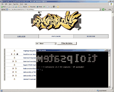 Metasploit — механизм на базе сценариев Perl, с помощью которого можно применять множество методов проникновения для различных платформ и приложений (на момент подготовки данной статьи известно более 75 способов проникновения, несущие 75 вариантов нагрузки, и это число увеличивается). Помимо набора методов проникновения через известные лазейки, Metasploit позволяет переслать в обнаруженную брешь конкретную программу. Например, проникнув в систему, не защищенную от SQL Slammer (см. выше раздел SQLRECON), можно выбрать способ манипулирования пораженной системой: создать соединение с помощью оболочки Win32 Bind, обратную посылку оболочкой Win32 Reverse, просто выполнить дистанционную команду, ввести вредную серверную DLL утилиты Virtual Network Computing (VNC) в пораженный активный процесс или применить другой метод. Metasploit Framework расширяется с использованием модулей Perl, поэтому можно подготовить собственные средства проникновения, включить их в инфраструктуру и воспользоваться готовой подходящей программой использования. На экране 2 показан удобный в применении Web-интерфейс Metasploit со списком методов проникновения.