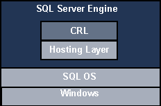 На рисунке показана архитектура SQL Server 2005 CLR. SQL OS (уровень абстракций SQL Server, лежащий выше ресурсов операционной системы) в первую очередь ответственна за обработку ключевых процессов, таких как транзакции; наложение атомарных, последовательных, изолированных, надежных (ACID) правил; управление блокировками; управление памятью; поддержка SQL Server Engine. CLR находится внутри среды SQL Server Engine. Уровень хостинга облегчает взаимодействие между SQL OS и CLR и прежде всего ответствен за загрузку и выгрузку сборки, управление памятью, выполнение предписаний модели защиты, определение числа распределенных потоков и нитей, обнаружение блокировок и формирование контекста исполнения. Введение языков CLR в SQL Server не удалось бы осуществить без изменений в SQL Server Engine, которые были сделаны для интеграции среды исполнения CLR.