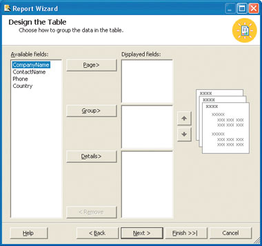Для второго отчета следует ввести тот же самый запрос, что использовался для первого отчета, и выбрать табличный стиль. На экране Design the Table надо ввести Country в окне списка Group и добавить CompanyName, ContactName и Phone к списку Details. Поскольку выбран элемент из списка Group, новый экран по имени Choose the Table Layout появляется перед экраном Choose the Table Style. Экран разметки таблицы включает окно с меткой Enable drilldown. Нужно выбрать переключатель Stepped, чтобы задействовать окно с меткой Enable drilldown. Следует указать Enable drilldown, чтобы значения полей CompanyName, ContactName и Phone появлялись только после того, как пользователь раскроет значение в столбце Country. Щелкните на Finish и дайте название второму отчету.
