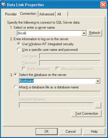 Для создания первого отчета нужно запустить новый проект в среде Visual Studio.NET и выбрать шаблон Report Wizard Project. Назовите проект SSMRS-Intro, прочитайте приветственный экран мастера, затем нажмите Next, чтобы попасть в окно Select the Data Source и установить источник данных отчета. Далее следует щелкнуть на Edit, чтобы открыть привычное диалоговое окно Data Link Properties, показанное на экране 1. В диалоговом окне Provider из таблицы нужно выбрать Microsoft OLE DB Provider для SQL Server в качестве типа данных, к которым требуется подключиться. Как показано на экране 1, закладка диалогового окна Connections позволяет установить для локального экземпляра SQL Server соединение типа Windows NT Integrated с базой данных Northwind. Щелкнем на Test Connection, а затем OK для возврата в окно Select the Data Source, которое теперь показывает строку соединения, указывающую на источник данных, названный по имени базы данных. Пока не помечен флажок Make this a shred source внизу экрана, мастер считает, что источник данных можно применять только к одному этому отчету.
