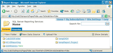 Вызов сервера отчетов. Пользователи с соответствующими правами могут соединяться с сервером отчетов, набирая в строке http://servername/reports. Для примера этой статьи имя сервера — cab233a. На экране 7 показано подключение к серверу отчетов cab233a и списку каталогов в домашнем каталоге. Щелкая в домашнем каталоге на любом каталоге (например, SSMRSIntro), можно просматривать содержимое выбранного каталога. Пользователи могут задействовать папки сервера отчетов для выполнения задач согласно ролям, назначенным учетной записи Windows и любых групп Windows, которым они принадлежат. Администратору позволено все. Сервер отчетов автоматически корректирует его пользовательский интерфейс, чтобы раскрыть права и элементы, связанные с ролью пользователя.