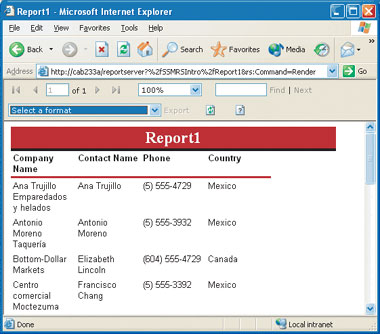 На экране 6 показана выборка из доступного через URL вида Report1. Здесь отчет появляется так же, как на экране 3, но Address box показывает URL, который содержит команду для визуализации отчета (rs:Command=Render). Кроме того, раскрывающийся список Select a format в верхней части окна позволяет пользователям сохранять отчет в различных форматах. Например, выбирая Acrobat (PDF) file из раскрывающегося списка, можно сохранять для автономного использования локальную копию отчета в формате PDF.