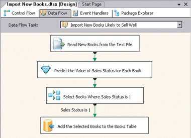 Процесс обработки данных (экран 9) считывает список имеющихся книг из текстового файла, а затем использует задачу трансформации Data Mining Prediction Query для прогнозирования статуса продаж каждой новой книги. Книги, отвечающие критерию бестселлеров (со статусом продаж 1), вносятся в таблицу Books и предлагаются в электронном магазине.