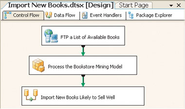 Обученную модель извлечения данных можно использовать в составе пакета SSIS, который импортирует список книг дистрибьютора. Как показано на экране 8, управляющая логика процесса получает текстовый файл из FTP-узла дистрибьютора, переобучает модель извлечения данных с использованием информации о текущих продажах и, наконец, запускает процесс обработки данных, в ходе которого выполняется собственно импорт.