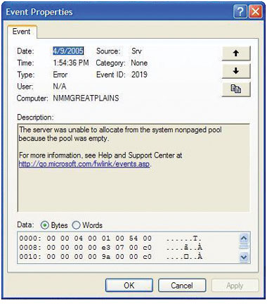Я получил журналы событий и первым делом просмотрел системный журнал. Первое, что я увидел, это сообщение об ошибке с ID 2019, появившееся на экране моего ноутбука. The server was unable to allocate from the system nonpaged pool because the pool was empty («Сервер не может выделить память из системного невыгружаемого пула, поскольку пул пуст»). Затем в журнале приложений я увидел событие с ID 208. Эта ошибка указывала на одно из приложений Great Plains, что было следствием общей проблемы.