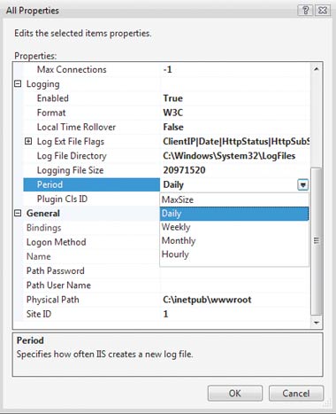 В окне All Properties (экран 2) можно редактировать все свойства для любого выбранного элемента. В данном примере параметру Log File (создание журнала) присвоено значение Daily (ежедневно). Чтобы изменить этот параметр, достаточно выделить пункт Sites, щелкнуть на All Properties и отыскать нужный элемент в окне All Properties.