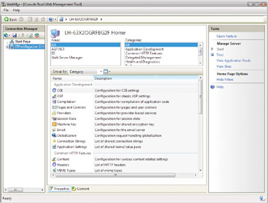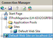 В левой панели IIS Manager, Connection Manager, отображаются все серверы IIS 7.0, к которым подключается IIS Manager. Для простоты использования соединениям можно дать имена (по умолчанию назначается имя сервера). В нашем случае имя соединения — ITProMagazine. Имя сервера — LH-63X2OGRFBG2F, как показано в верхней части центральной панели.