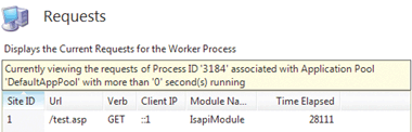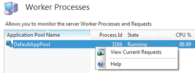 В любое время можно обратиться к экрану Worker Processes, который показан на экране 4, из инструмента IIS Manager, чтобы увидеть текущий коэффициент использования памяти, процессора, идентификационный номер процесса и назначение пула приложений для рабочего процесса. В данном примере видно, что пул потребляет слишком много ресурсов процессора. Чтобы увидеть все запросы, одновременно обрабатываемые в рабочем процессе, назначенном данному пулу, можно щелкнуть правой кнопкой мыши и выбрать пункт View Current Requests. В примере на экране 5 test.asp выполняется на узле Site 1, и для его обработки потребовалось 28 111 миллисекунд.