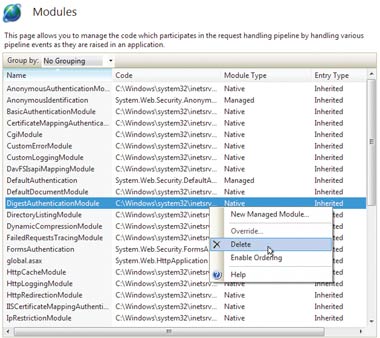 Переходим к самому важному. Как правило, для активизации и отмены функций в IIS следует устанавливать и сбрасывать флажки или задавать свойства иным способом. Функции IIS 7.0 распределены более чем по 40 модулям. Если компонент не используется (например, Digest Authentication), то его можно просто удалить из IIS 7.0 (экран 6).